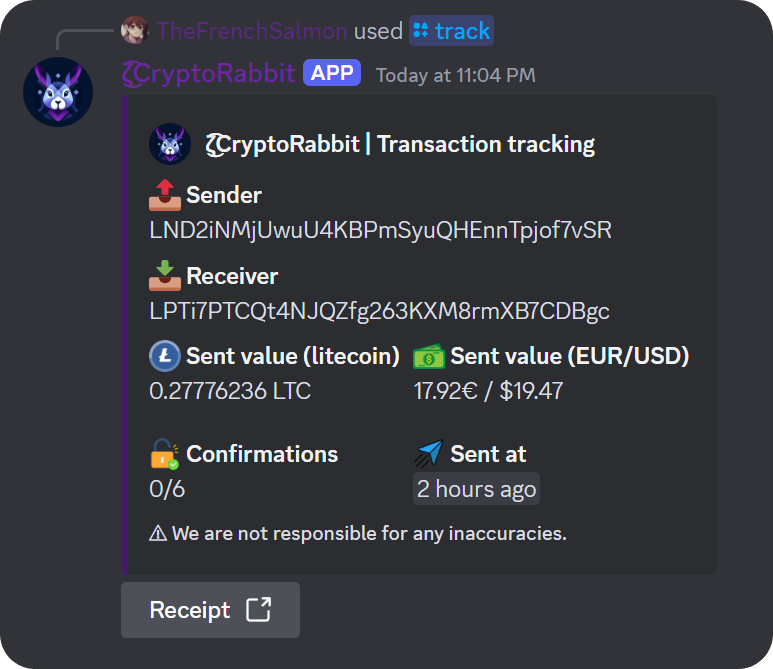 Get real-time cryptocurrency payment proof from your Discord server or a DM (with the user-app). Safer than a screenshot, faster than sending a proof link.