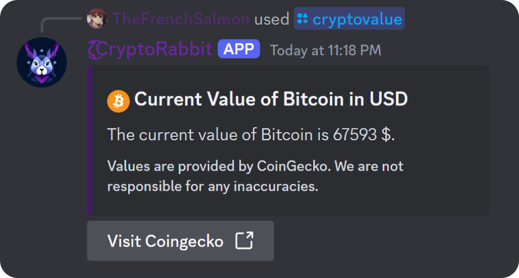 Get real-time updated cryptocurrency prices with the /cryptovalue command.